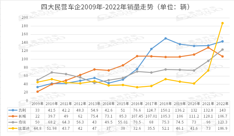 吉利反超长城,用时6年。2011年,长城哈弗H6横空出世,开启“聚焦SUV”路线,年销量超过吉利,并于五年后年销量突破百万辆。而在这之前,奇瑞是民营车企领军者。2009年时,奇瑞50万辆的销量接近长城和吉利两家之和。