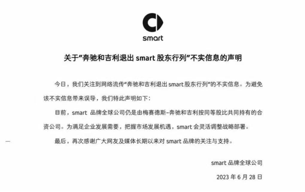 对此,smart品牌发布关于"奔驰和吉利退出smart股东行列不实信息的声明,强调目前,smart品牌全球公司仍是由梅赛德斯-奔驰和吉利按同等股比共同持有的合资公司。并表示,为满足企业发展需要,把握市场发展机遇,smart会灵活调整战略部署。