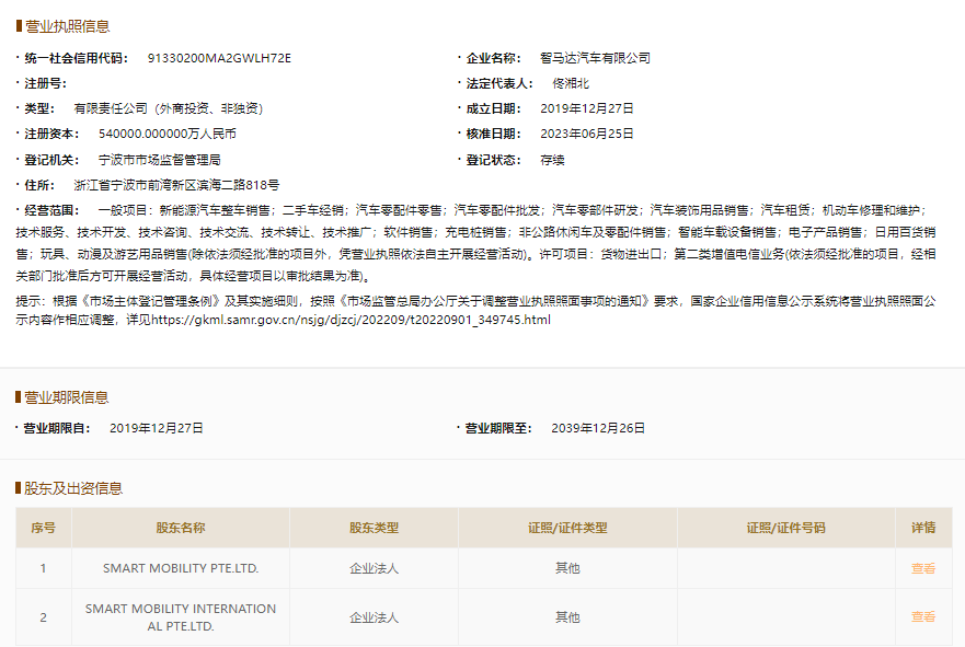 同月25日,投资人(股权)发生变更,吉利汽车集团有限公司和梅赛德斯-奔驰股份有限公司退出股东行列,SMART MOBILITY INTERNATIONAL PTE.LTD.和SMART MOBILITY PTE.LTD.成为控股股东,分别持股50%。查询天眼查App发现,暂无关于两家股东的信息。