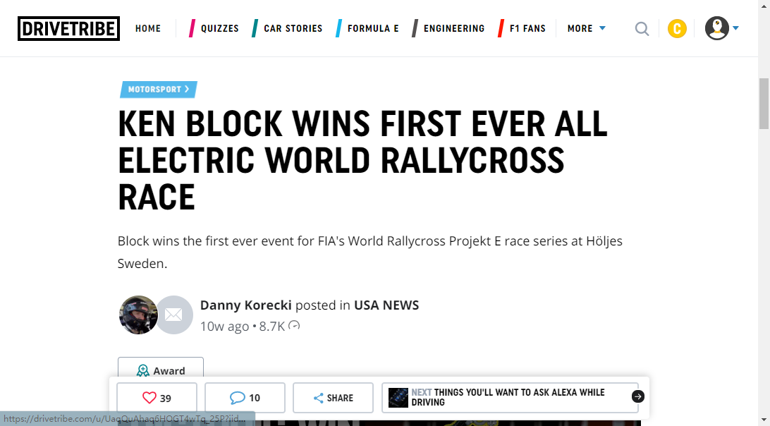 日前,在2020年世界拉力锦标赛瑞典赫利耶斯赛道,有“漂移大神”之称的美国车手Ken Block驾驶福特纯电拉力赛车Fiesta ERX2亮相今年增设的Projekt E纯电公路拉力系列赛,首战即获得冠军。