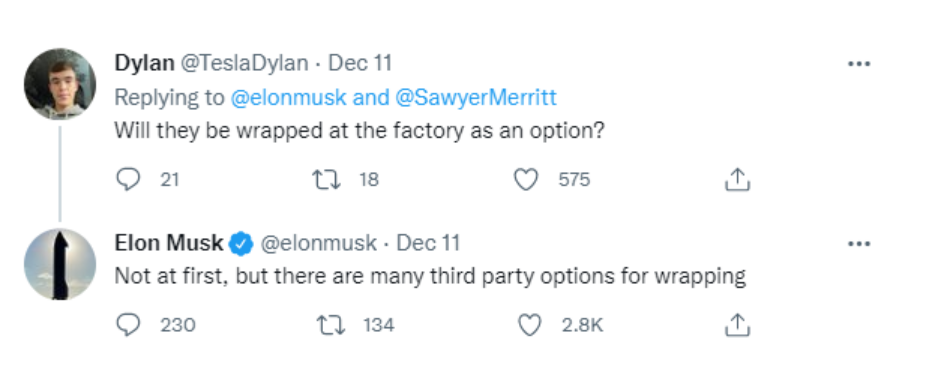 这表明,特斯拉最终可能会为Cybertruck提供外膜,但该公司并没有将其作为优先选择,买家必须首先求助于第三方。