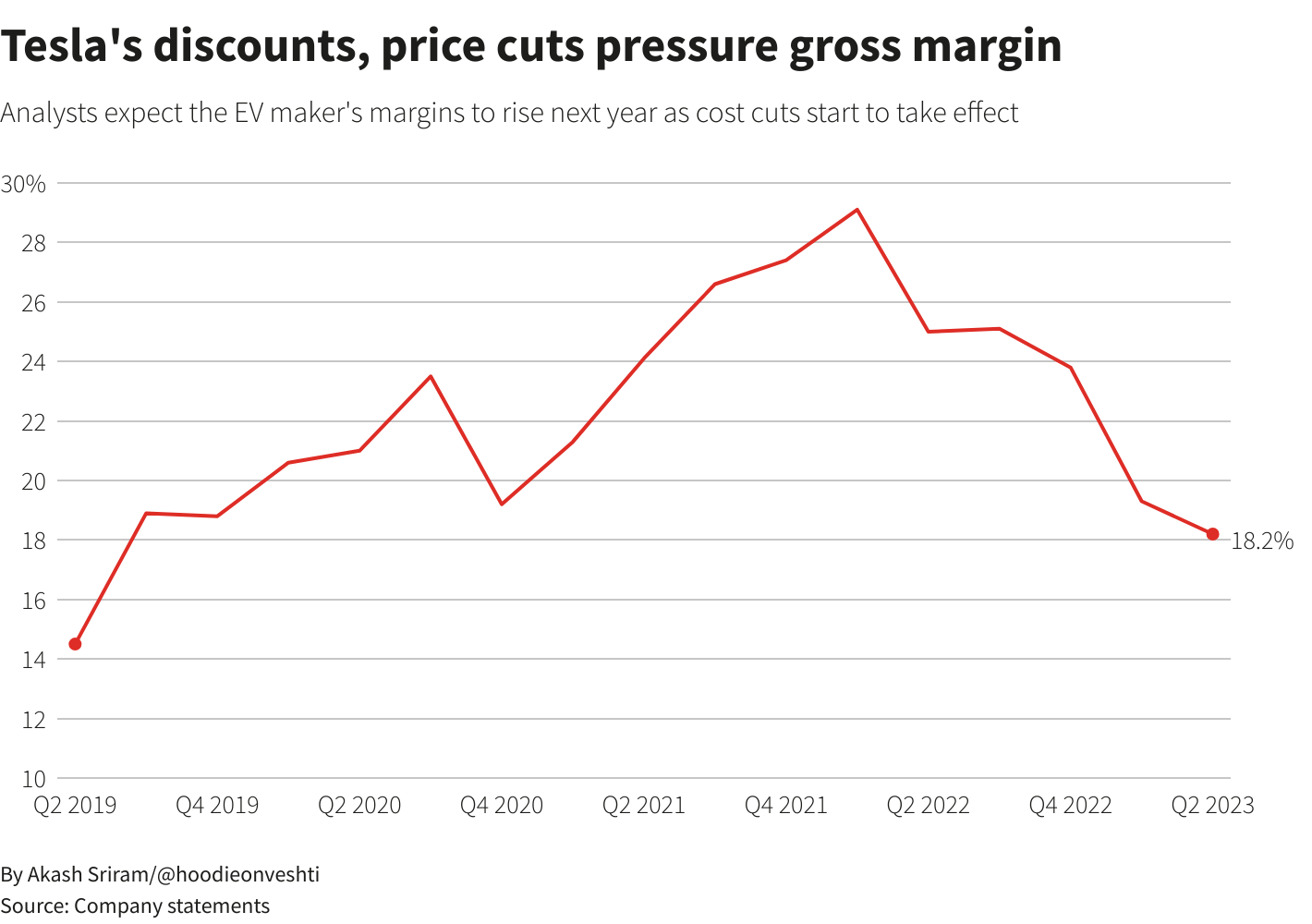 根据路透社的计算,特斯拉第二季度汽车毛利率(不包括监管积分)从第一季度的19%降至18.1%。这与华尔街的预期相符,但与一年前公布的26%相差甚远。去年年初,特斯拉的汽车业务利润率超过了30%。