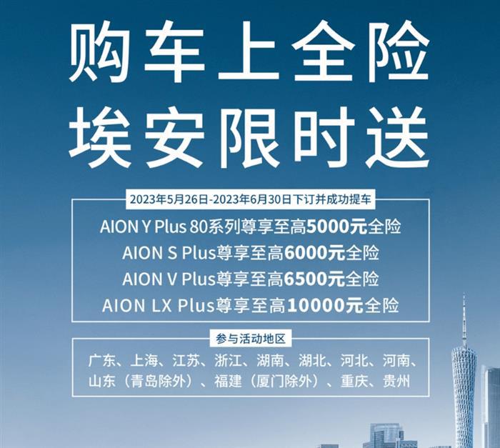 5月28日,埃安汽车推出“购车上全险,埃安限时送”活动。2023年5月26日-6月30日期间,购买埃安旗下多款车型,享至高10000元全险补贴,同时还可叠加享受金融贴息、置换补贴、新车充电礼等多重新车金融礼。