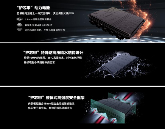 “护芯甲”动力电池外壳采用1.6mm超高强度钢制箱体,外壳熔点高达1500℃;同时在电芯与外壳底部,也预留了30mm的隔热间距,并填充大量的隔热材料;内部模组融合15mm铝合金吸能端板设计,电芯置于最中心,有效的抵抗外部冲击。