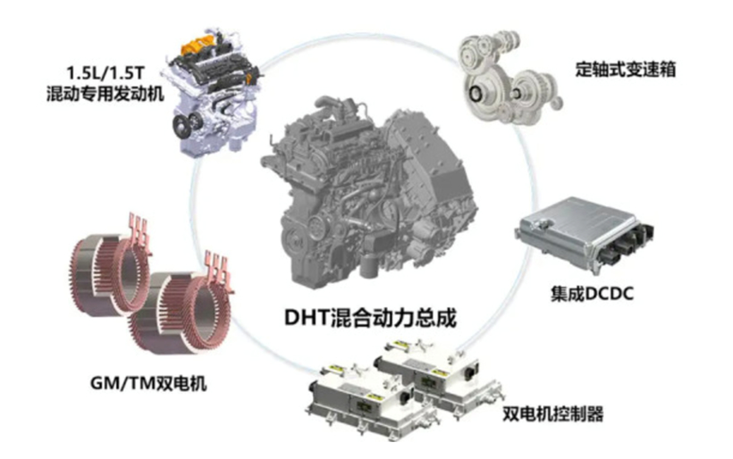 柠檬混动DHT系统采用的是高效混动发动机和双电机混联方案,集成度比较高,号称“七合一”,将1.5L/1.5T混动专用发动机、发电/驱动双电机、定轴式变速箱、双电机控制器、集成DCDC高度集成。