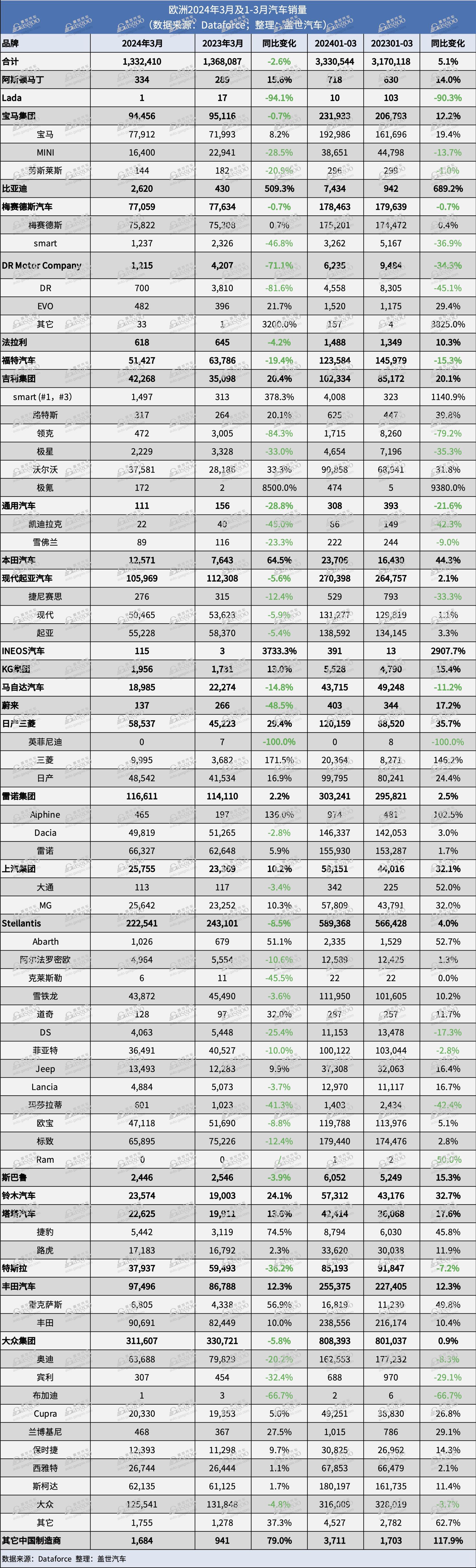 相比之下,奥迪和特斯拉3月份的表现不佳。奥迪的销量同比下降20.2%,至63,688辆,排名下滑至第7名,而在2023年3月,奥迪的销量排名第三。特斯拉的销量同比下跌36.2%,排名也从2023年3月的第10名降至第16名。