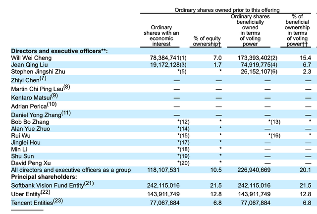虽然从股东名单上来看,滴滴的股权较为分散,但根据中概股常规同股不同权安排,程维柳青合计拥有超过48%的投票权,包括程维柳青在内的滴滴管理层拥有超过50%的投票权,因此在上市之后,滴滴的掌舵者依旧是现有的公司管理层。