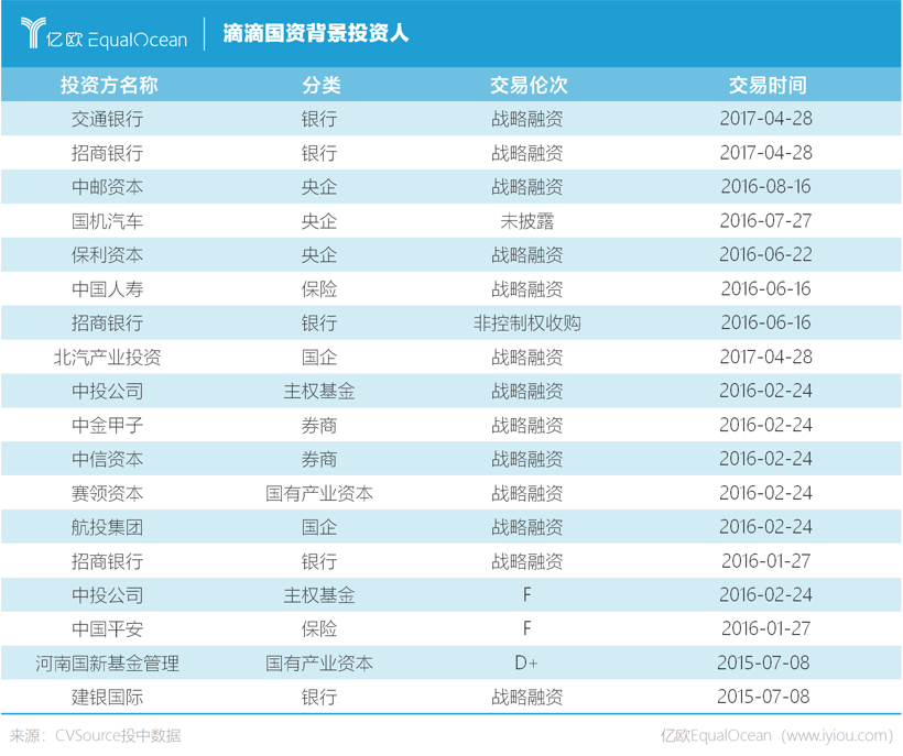 自2015年以来,一共有近20家国资背景的投资人入股滴滴。该公司的国资背景投资人不仅有交通银行、建设银行和招商银行这样的银行机构,还有中国平安、中国人寿等保险巨头,还有北汽产业基金、航投集团、赛领资本等国企的产业投资基金和一些政策型的投资基金。