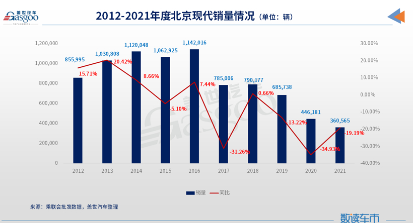 2017年之后,伴随自主品牌的崛起,以及中国汽车市场由增量向存量阶段过渡,以性价比著称的韩系车在市场上的优势地位迅速被降低。于是,自2017年从年销百万辆神坛上跌落的北京现代,至今没有起势,且自2020年以来,受疫情和缺芯的大环境影响,其市场表现更是每况愈下。去年,北京现代全年销量仅为36万辆,萎缩至2009年以前的水平,也直接将韩系车整体的市场占有率拉低至2.4%。