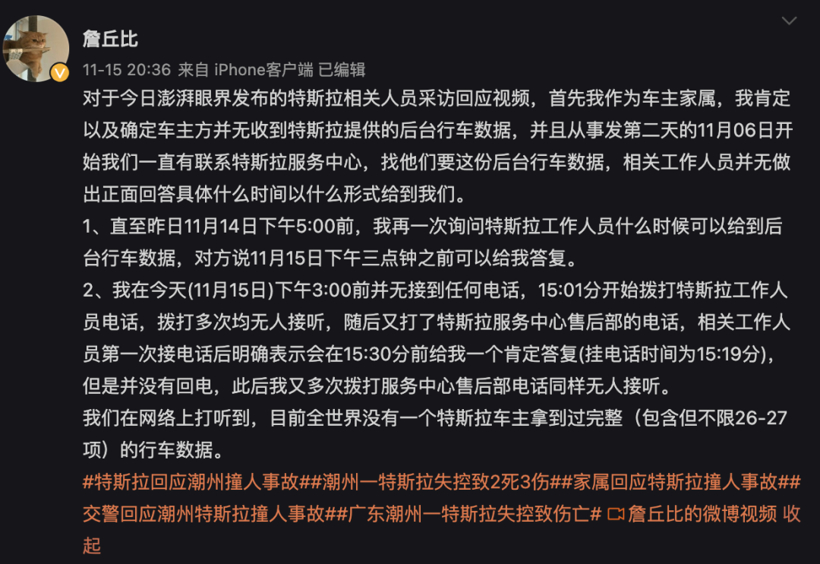 而车主方面在微博上也表示;“车主方并无收到特斯拉提供的后台行车数据”。