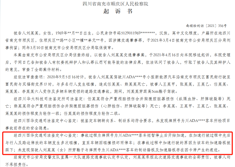 2020年9月5日,由刘某驾驶的特斯拉在四川省南充市顺庆区富民街城区行驶时,突然撞上多辆车和多名行人,事故造成2人死亡、6人受伤,另有多车受损。
