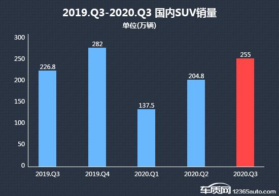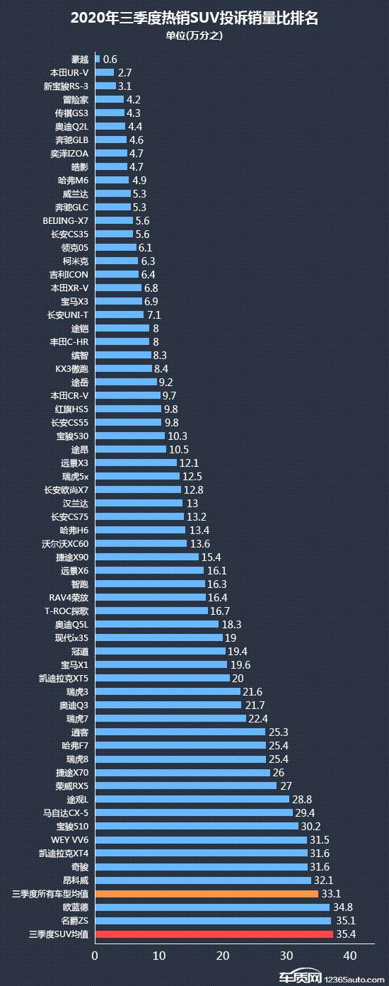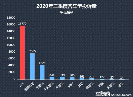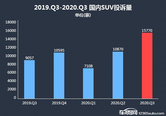 据乘联会提供的全国汽车产销数据显示,2020年三季度国内SUV(除进口车)销量约为255万辆,其中9月份销量最高,约为96.4辆。据国内领先的缺陷汽车产品信息和车主质量投诉信息收集平台车质网投诉数据显示,2020年三季度国内SUV整体投诉量为15,770宗,有销量数据支撑的三季度SUV投诉销量比均值为万分之35.4,SUV整体投诉销量比表现略差于二季度的万分之33.8。