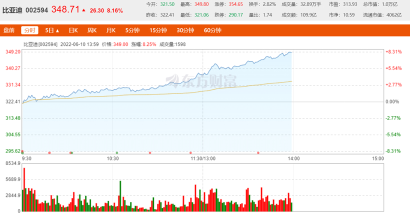 截至6月10日13时59分比亚迪股价走势;图片来源:东方财富网