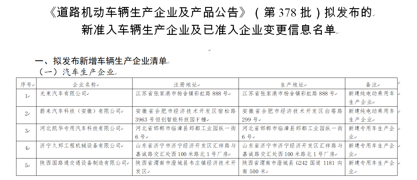 不久前,在工信部公示的《道路机动车辆生产企业及产品公告》(第 378 批)拟发布新增车辆生产企业清单中,出现了“蔚来汽车科技(安徽)有限公司”和“光束汽车有限公司”的名字。 进入拟发布新增车辆生产企业清单名列,意味着什么呢?首先说明企业已经通过了相关部门的资质审核;其次,在通过了公示期之后,上榜企业将正式获得相关的生产资质。
